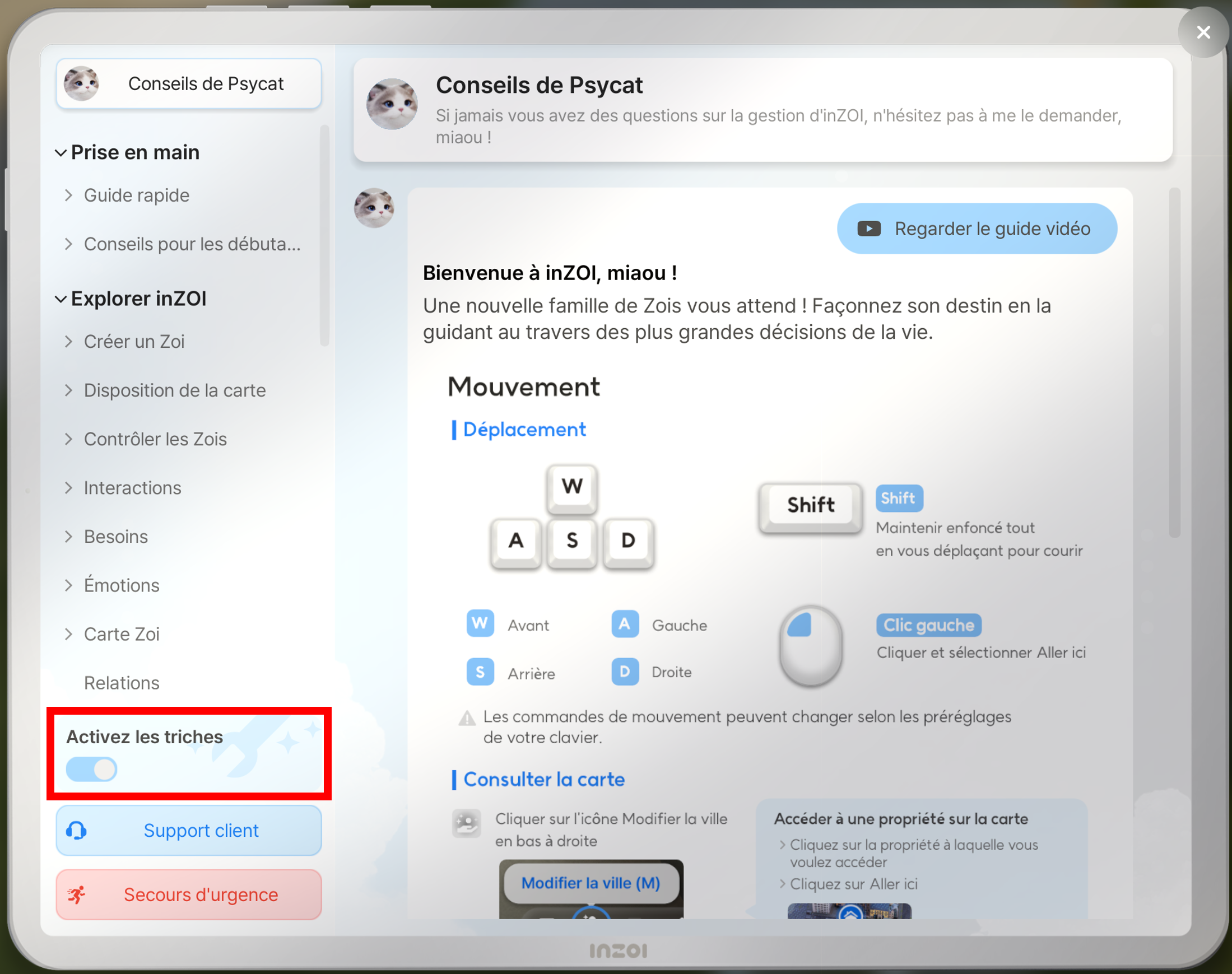 Pour utiliser les codes de triche dans inZOI, accédez au Guide Psycat et utilisez la fonctionnalité Activer les triches.