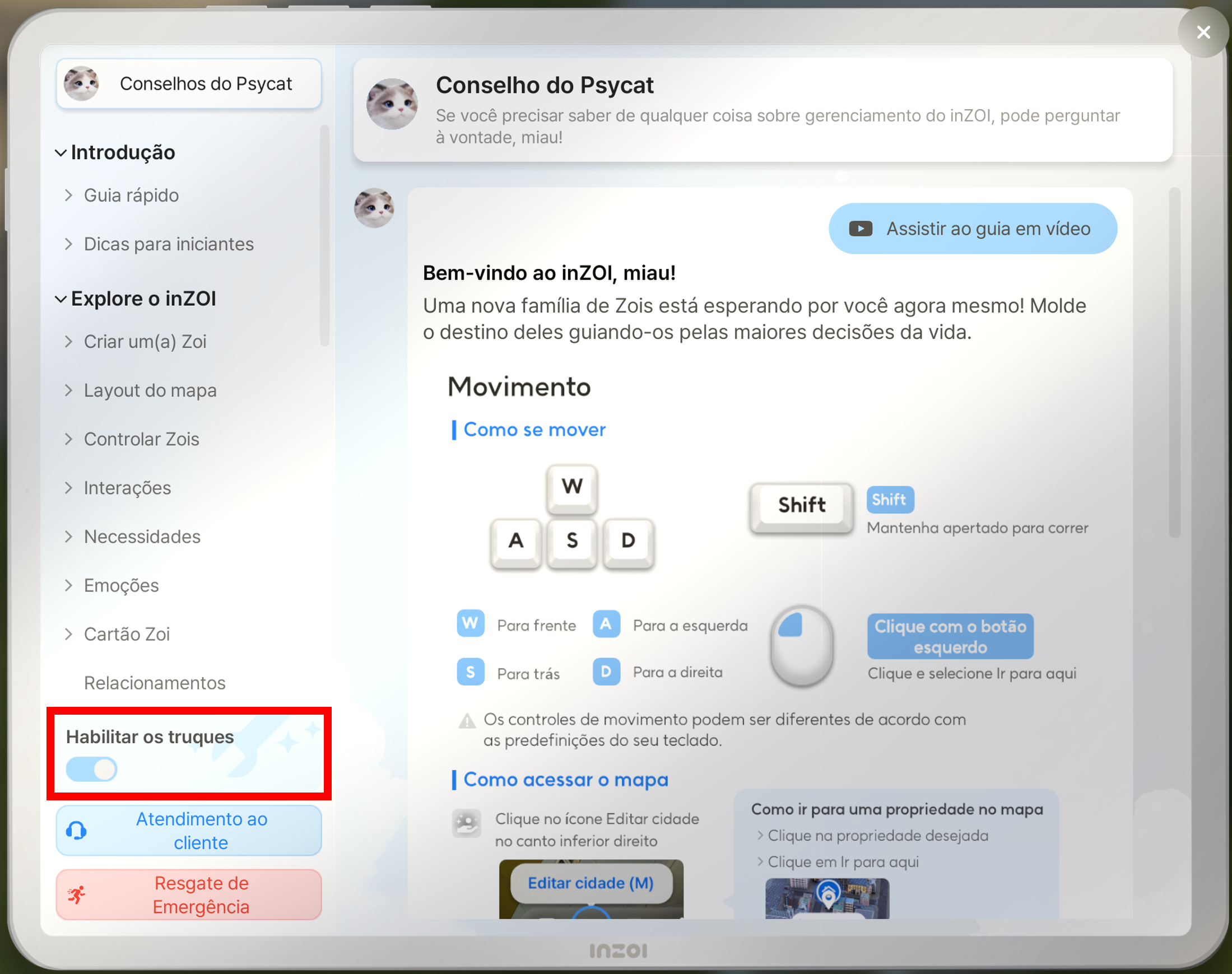 Para usar cheats no inZOI, navegue até o Guia Psycat e use o recurso Ativar cheats.