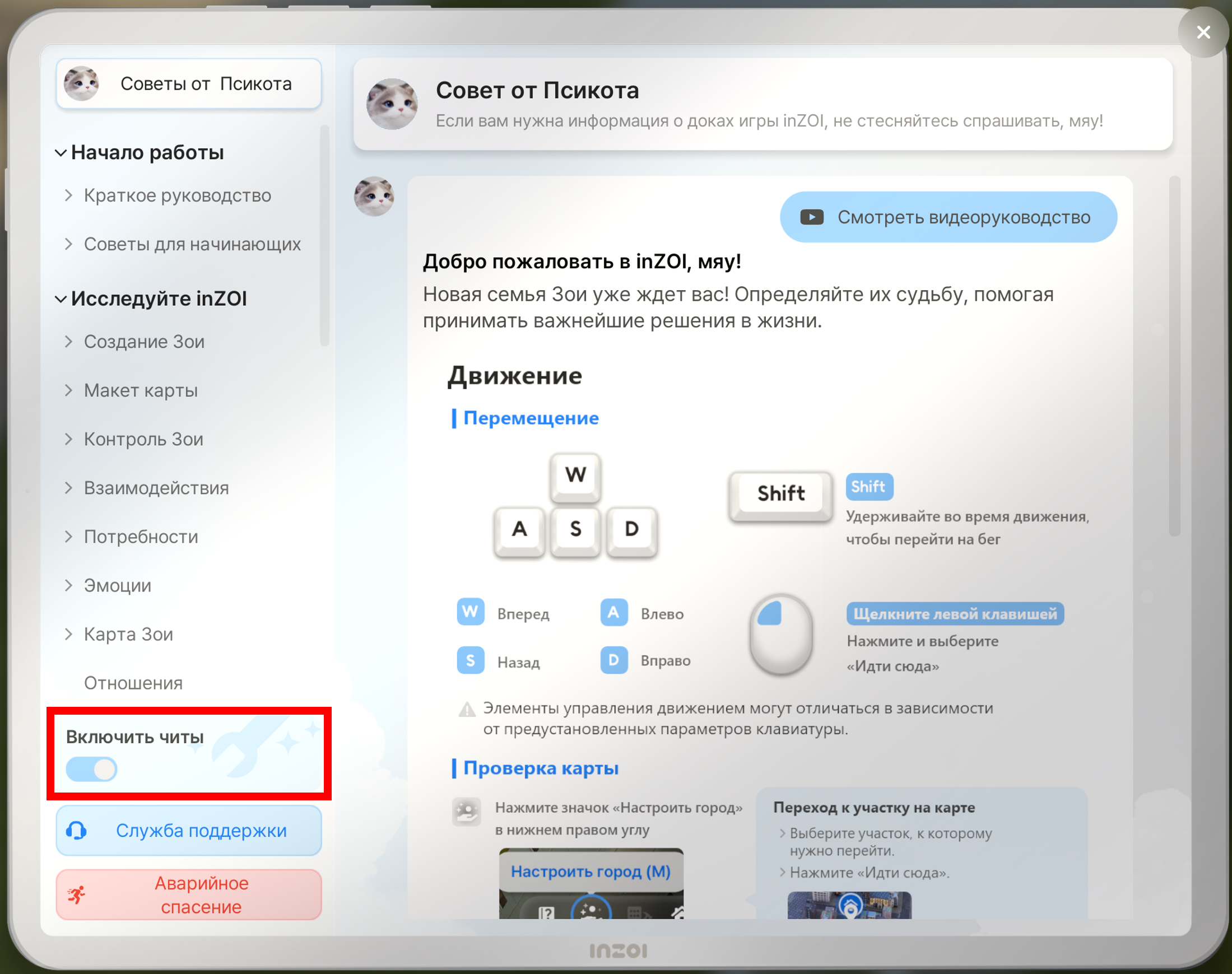 Чтобы воспользоваться читами, перейдите в «Руководство Псикота» и активируйте функцию «Включить чит-коды»
